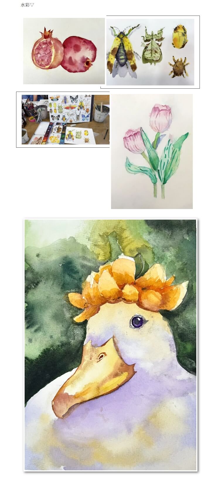 去年一个蹦蹦跳跳的小女孩来到了我们的课室,对我说:我最近在准备钢琴的考试,但是我现在来画画!跳跃的话语间也展示着她的睿智与阳光!在接下来的一段时间里,小女孩学习画画也是进步飞快,陪在旁边的妈妈也受到了感染,跟着一起练习起了水彩,所以才有了这一系列非常优秀的亲子作品集!