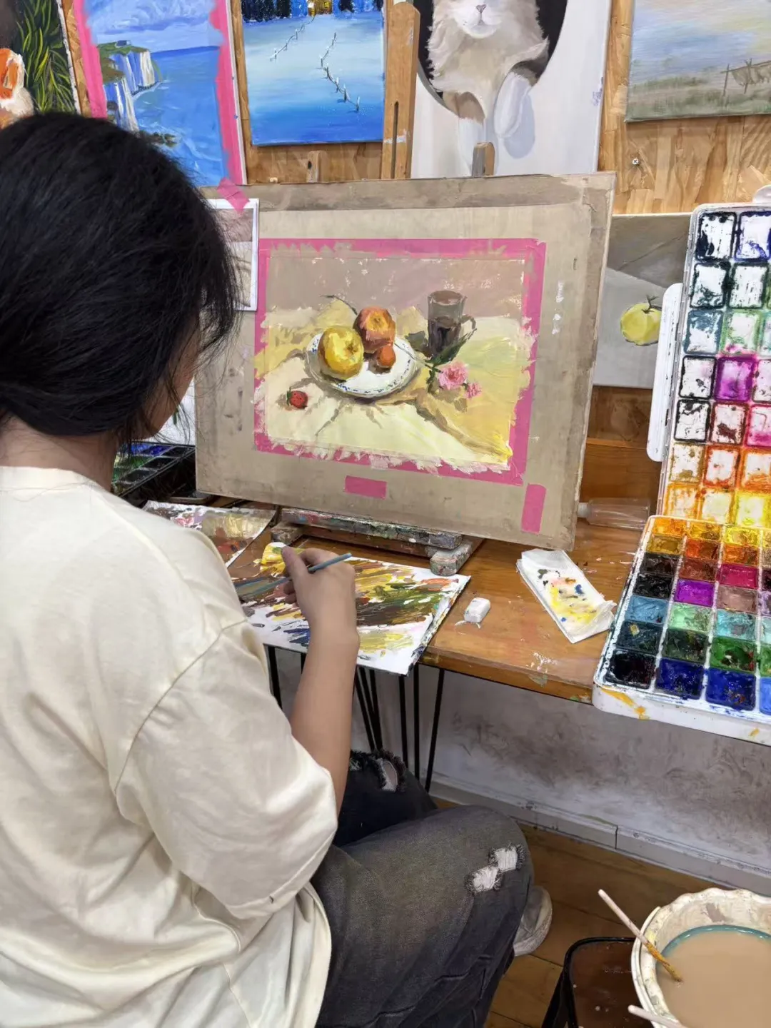 学习初期,我从素描入手,反复练习线条、形体、明暗关系,从简单静物到复杂静物组合,逐步学习基础造型与简单构图技巧。随后深入学习色彩,理解色调搭配、光影与环境色的关系,在无数次的反复调色中提升色感与画面表现力。